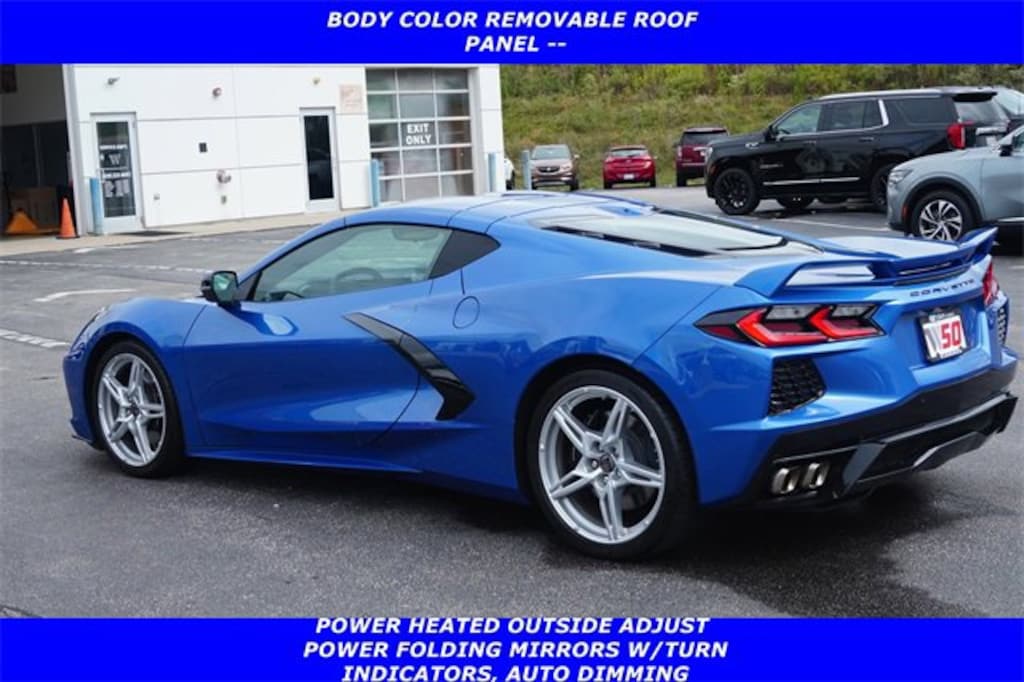 Jeff Wyler Florence Buick GMC is very proud to offer this great 2023 Chevrolet Corvette Stingray in Elkhart Lake Blue Metallic. Custom Leather Wrapped Interior Package, Memory Driver & Passenger Convenience Package, Preferred Equipment Group 3LT (2 Cargo Nets, Driver Power Bolster Seat Adjuster, Electrical Theft Deterrent System, HD Front & Rear Vision Cameras, Head-Up Display, Heated & Vented Driver & Passenger Seats, Heated Steering Wheel, Passenger Power Bolster Seat Adjuster, Performance Data & Video Recorder, Power Driver Lumbar Control Seat Adjuster, Power Passenger Lumbar Control Seat Adjuster, Power-Adjustable Outside Heated Mirrors, Rear Camera Mirror, Rear Cross Traffic Alert, Side Blind Zone Alert, Sueded Microfiber-Wrapped Upper Interior Trim Pkg, Universal Home Remote, Vehicle Inclination Theft Deterrent Sensor, Vehicle Interior Movement Theft Deterrent Sensor, and Wireless Charging for Devices), Z51 Performance Package (Electronic Limited-Slip Differential, Heavy-Duty Cooling System, Performance Exhaust w/Stainless-Steel Tips, Performance Rear Axle Ratio, Rear Z51 Spoiler, Z51 Performance Brakes, and Z51 Performance Suspension), 14 Speakers, 8-Way Power Driver Seat Adjuster, 8-Way Power Passenger Seat Adjuster, Apple CarPlay/Android Auto, Auto-dimming door mirrors, Automatic temperature control, Bose Performance Series Sound System w/14 Speakers, Bumpers: body-color, Delay-off headlights, Front dual zone A/C, Fully automatic headlights, GT2 Bucket Seats, HD Radio, Heads-Up Display, Heated door mirrors, Memory seat, Napa Lthr Seating Surfaces w/Perforated Inserts, Navigation System, Performance Traction Management, Power driver seat, Power passenger seat, Premium audio system: Chevrolet Infotainment 3 Premium, Radio: Chevrolet Infotainment 3 Premium System, Remote keyless entry, SiriusXM Radio, Steering wheel memory, Steering wheel mounted audio controls, Turn signal indicator mirrors, Wheels: 19 x 8.5 Fr/20 x 11 Rr Bright Silver, Z51 Perf Suspension w/Magnetic Selective Ride Cntrl, 4-Wheel Disc Brakes, ABS brakes, Air Conditioning, Alloy wheels, AM/FM radio: SiriusXM, Auto-dimming Rear-View mirror, Body-Color Removable Roof Panel, Brake assist, Compass, Driver door bin, Driver vanity mirror, Dual front impact airbags, Dual front side impact airbags, Electronic Stability Control, Emergency communication system: OnStar and Chevrolet connected services capable, Four wheel independent suspension, Front anti-roll bar, Front Bucket Seats, Front Center Armrest, Front License Plate Bracket, Front reading lights, Garage door transmitter, Heated front seats, Heated steering wheel, Illuminated entry, Leather Shift Knob, Leather steering wheel, Low tire pressure warning, Occupant sensing airbag, Outside temperature display, Overhead console, Panic alarm, Passenger door bin, Passenger vanity mirror, Power door mirrors, Power steering, Power windows, Radio data system, Rear anti-roll bar, Rear window defroster, Security system, Speed control, Speed-sensing steering, Sport steering wheel, Tachometer, Telescoping steering wheel, Tilt steering wheel, Traction control, Trip computer, Variably intermittent wipers, Ventilated front seats, and Voltmeter Our PRE-OWNED vehicles are put through a rigorous 167- POINT QUALITY ASSURANCE INSPECTION along with an average amount of over $1,400.00 SPENT to recondition each vehicle so we can be sure to deliver you the highest quality vehicle like you deserve! ***ONLINE PRICE DOES NOT INCLUDE WYLER FAMILY FIRST PACKAGE*** Stop by 1154 Burlington Pike Florence KY 41402to see for yourself, or give us a call @ 859-525-8001 to schedule your test drive!